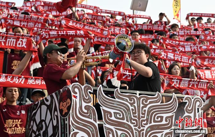 4月6日,嘉兴队球迷们添油助势。当日,浙江省垣市脚球联赛(“吴越杯”)掀幕战正在嘉兴挨响,“草根球员”们正在赛场睁开顽抗,终究嘉兴队1比0打败衢州队。中新社记者 王刚刚 摄