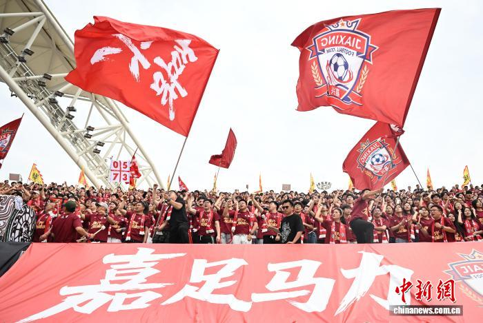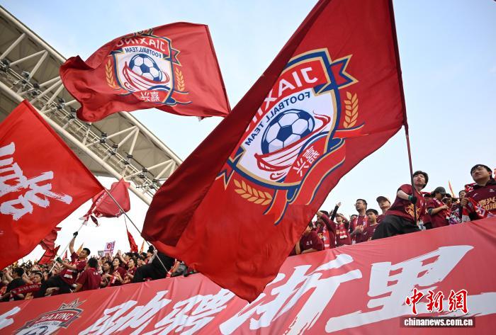 4月6日,嘉兴队球迷们摇旗吆喝。当日,浙江省会市脚球联赛(“吴越杯”)掀幕战正在嘉兴挨响,“草根球员”们正在赛场睁开反抗,终究嘉兴队1比0打败衢州队。中新社记者 王刚刚 摄